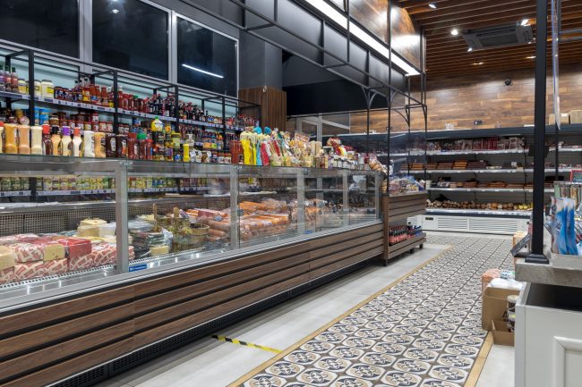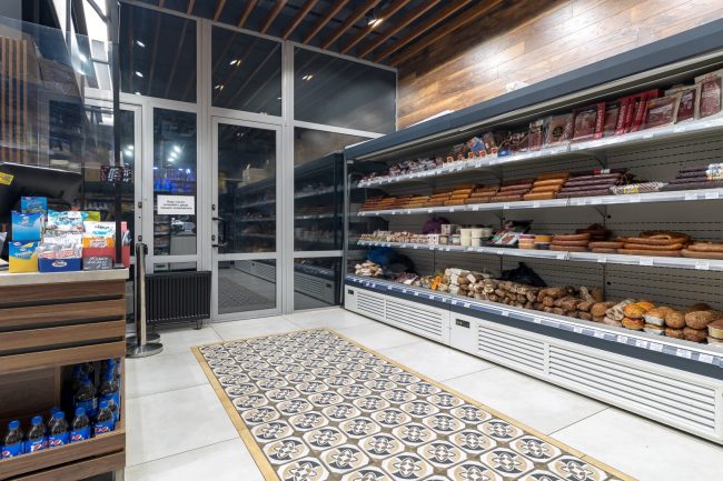 Місце для електронної ваги, де покупці можуть зважити вибрані продукти, виділено за допомогою дерев’яної панелі, що нагадує розташовану біля каси, однак тут лінії стали вертикальними.