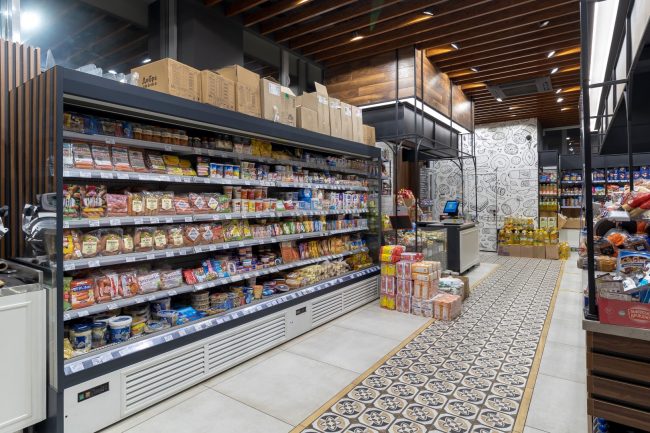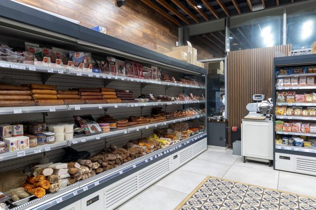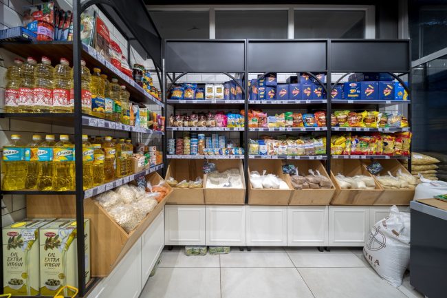 Дизайн стелажів для продуктів — типовий притаманний стилю лофт. Стелажі виконано з металевих рейок, надійно зварених та пофарбованих в чорний колір.