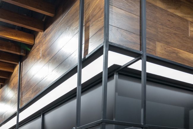 Дизайн стола касира витриманий в тому ж стилі, від оздоблений з панеллю з горизонтально розташованих планок з натурального дерева. Оригінальними елементами стали металеві конструкції типу стелажів, що височіють над столами та досягають стелі.