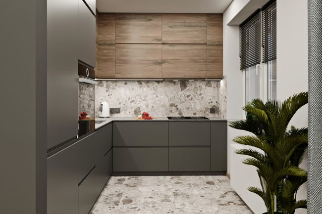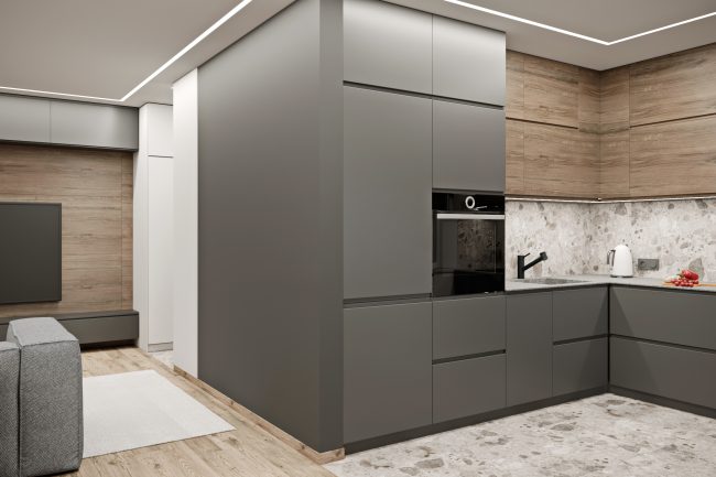 Кухня і вітальня об’єднані в одну функціональну зону, створюючи відчуття простору та відкритості. Вся техніка на кухні вбудована, включаючи прихований холодильник, що додає лаконічності загальному дизайну. На підлозі використаний ламінат під дерево, що додає тепла та затишку інтер’єру.