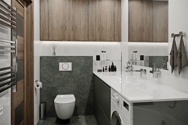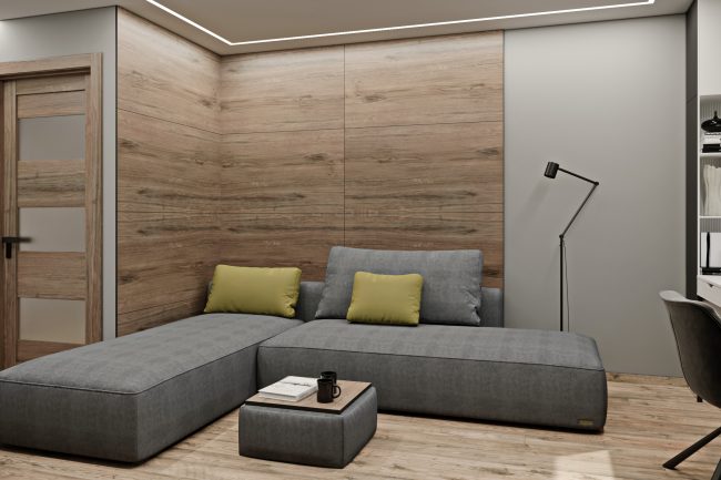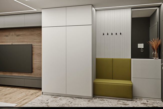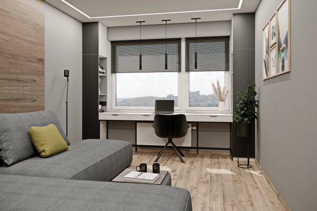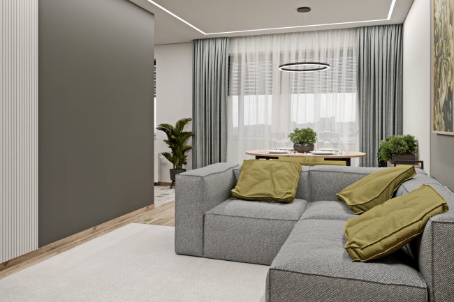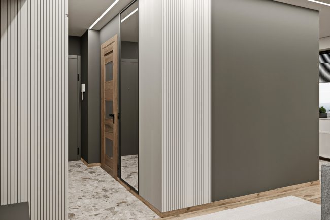 Ця двокімнатна квартира, виконана в сучасному стилі, створена для тих, хто цінує зручність та естетику. У вітальні стіна за диваном оформлена білими рейками, що додає інтер’єру легкості та стилю. Багато поверхонь під бетон надають приміщенню сучасного індустріального вигляду.
