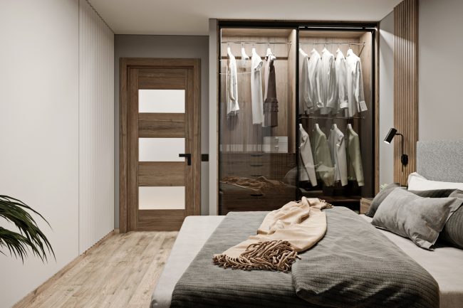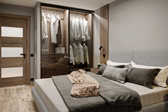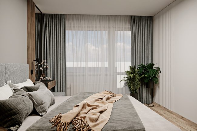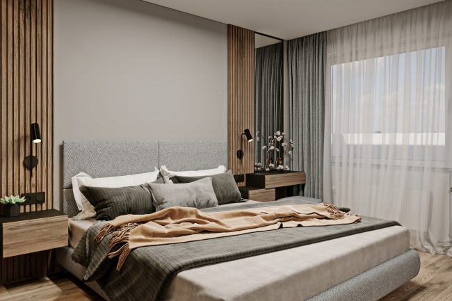 Спальня затишна та функціональна, з робочим місцем, яке також виконує роль візажного столика, що робить простір багатофункціональним та практичним.
