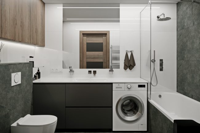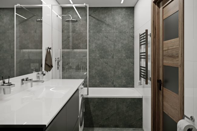 У ванній кімнаті підлога викладена плиткою під бетон, що підкреслює сучасний характер дизайну та створює зручність у догляді.