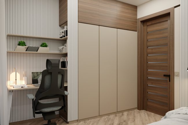 Спальня оформлена в спокійних тонах з використанням природних матеріалів. Тут розміщене комфортне двоспальне ліжко з м’яким головою, що створює затишну атмосферу для відпочинку. Шафа з дерев'яними фасадами гармонійно вписується в інтер’єр, надаючи достатньо місця для зберігання речей.