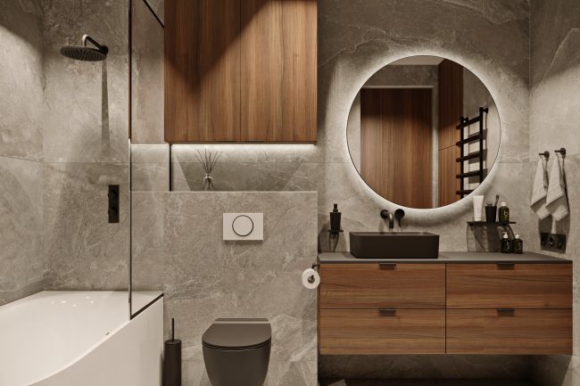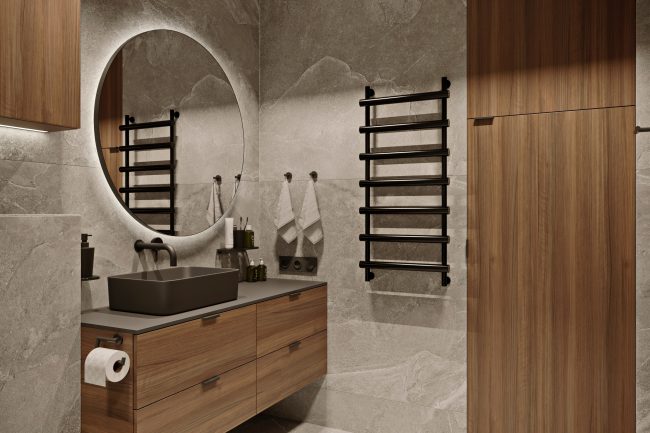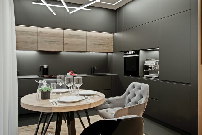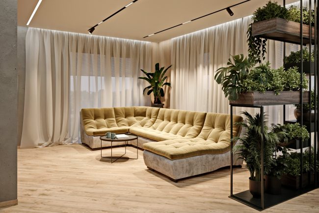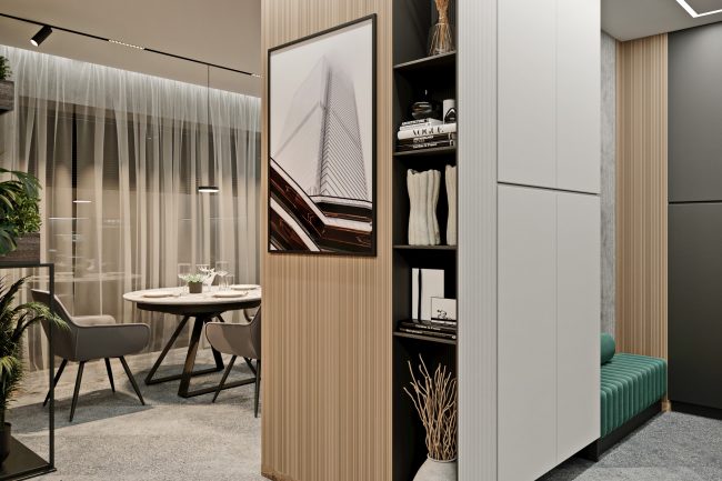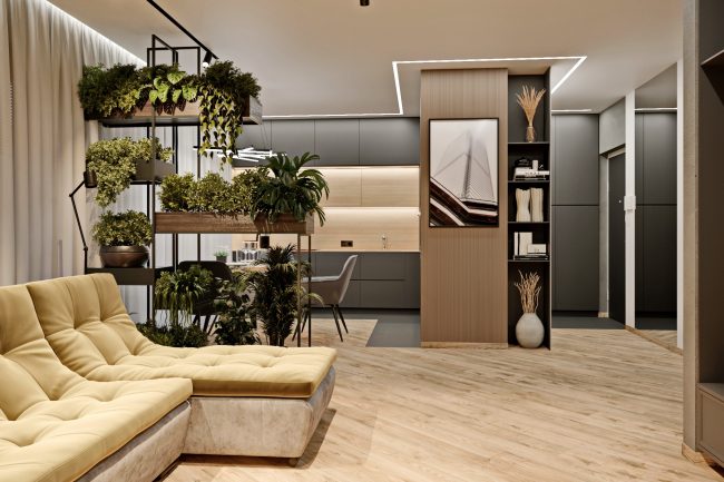 Використання фактури дерева на підлозі та у меблях підкреслює зв'язок з природою і додає інтер'єру тепла. Дерев’яні елементи створюють контраст з сучасними аксесуарами, надаючи простору вишуканого вигляду.