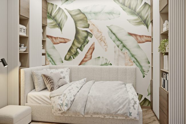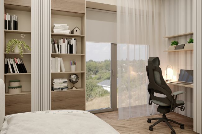 Дитяча кімната вражає своїм дизайном та функціональністю. Вона обладнана односпальним ліжком, затишним куточком для відпочинку та робочим столом, що створює ідеальні умови для навчання та творчості. Яскраві акценти у декорі надають кімнаті життєрадісного настрою.